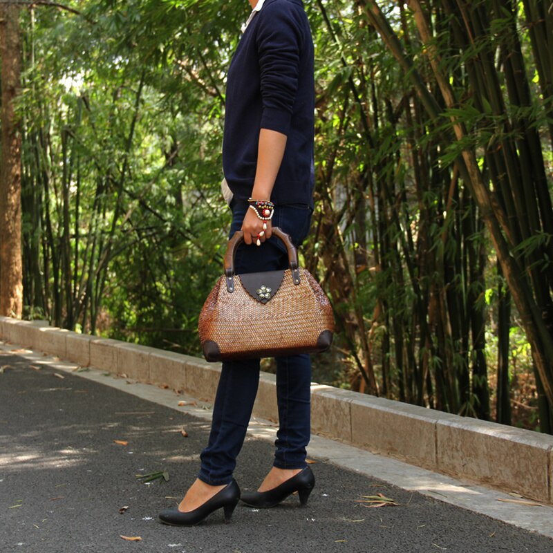 Vintage wooden handle woven ladies handbag